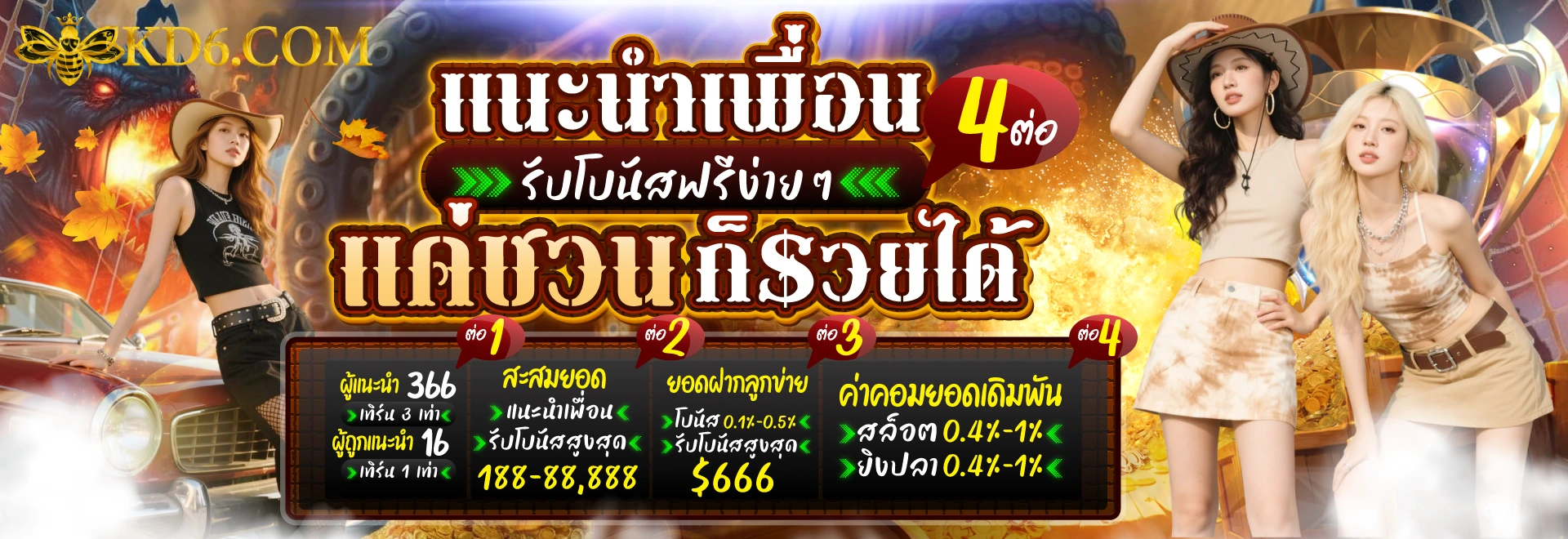 ในส่วนของการแนะนำเพื่อน สมาชิกจะได้รับค่าคอมมิชชั่น 0.5% จากยอดเดิมพันของเพื่อนที่แนะนำมา โดยไม่จำกัดจำนวนการแนะนำ ยิ่งแนะนำมาก ยิ่งได้รับผลตอบแทนมาก นอกจากนี้ยังมีกิจกรรมพิเศษตามเทศกาลต่างๆ ที่มอบรางวัลและโบนัสเพิ่มเติมอย่างต่อเนื่อง
